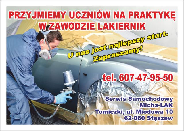 18 sierpnia 2025 Oferta praktyk zawodowych Firma Serwis Samochodowy Micha-LAK w Tomiczkach oferuje praktyki dla uczniów szkoły branżowej w zawodzie lakiernik samochodowy. KONTAKT: Serwis Samochodowy Micha-LAK Tomiczki, ul. Miodowa 10 tel. 607-479-550