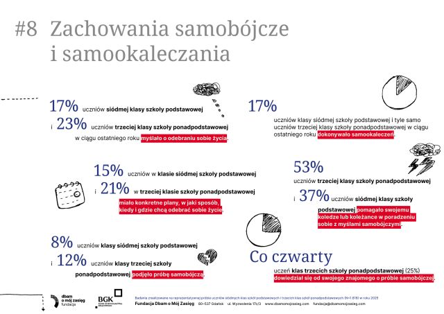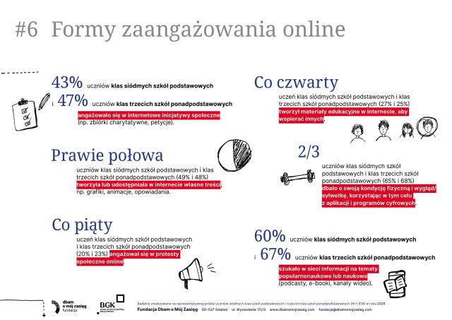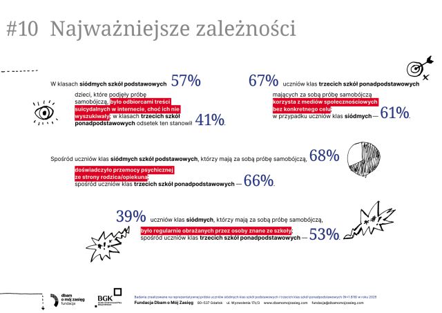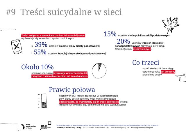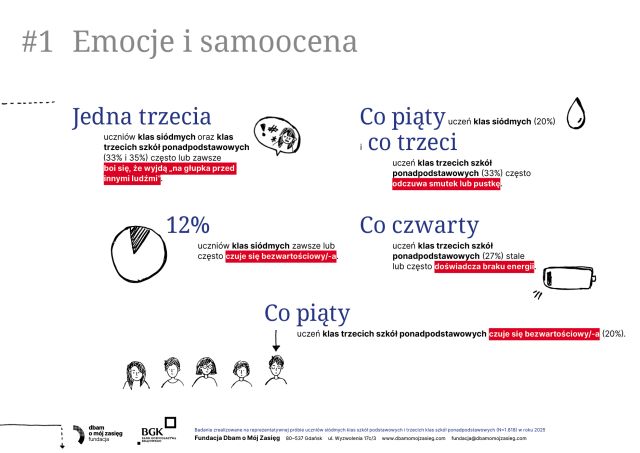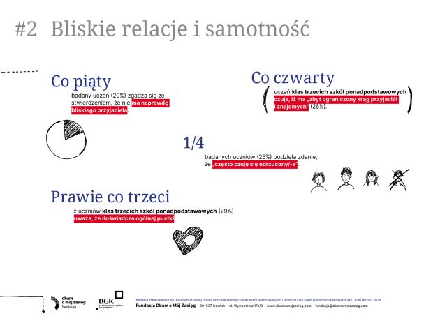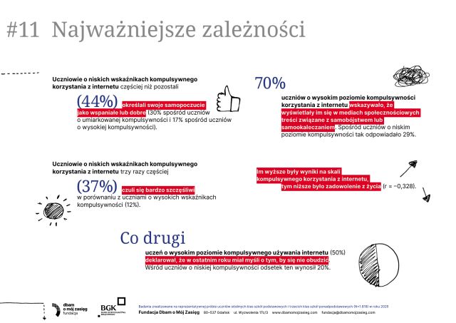 Nowy raport „Dobre i złe wiadomości – życie online i offline a zdrowie psychiczne polskich nastolatków” pokazuje, że młodzi żyją dziś w dwóch równoległych światach – i oba silnie wpływają na ich samopoczucie. Internet daje im wsparcie, kontakt z rówieśnikami i poczucie przynależności, ale jednocześnie zwiększa presję, naraża na porównania i cyberprzemoc. Z kolei życie offline – relacje rodzinne, aktywność fizyczna, sen i bezpieczeństwo w szkole – okazuje się kluczowym „buforem ochronnym” dla psychiki. Eksperci podkreślają, że nie chodzi o ograniczenie technologii, lecz o równowagę i uważność dorosłych na sygnały kryzysu. Raport przypomina, że dobrostan nastolatków zależy dziś bardziej niż kiedykolwiek od wsparcia, rozmowy i mądrego towarzyszenia im w świecie online i offline. Zachęcamy do zapoznania się z całym raportem: https://dbamomojzasieg.pl/wp-content/uploads/2025/11/Dobre-i-zle-wiadomosci.-raport-z-badan-1.pdf