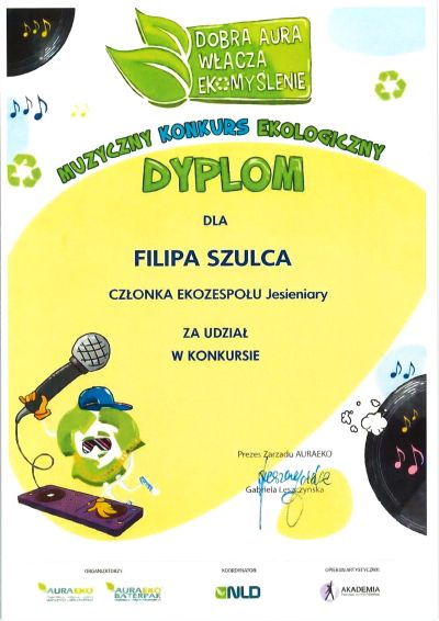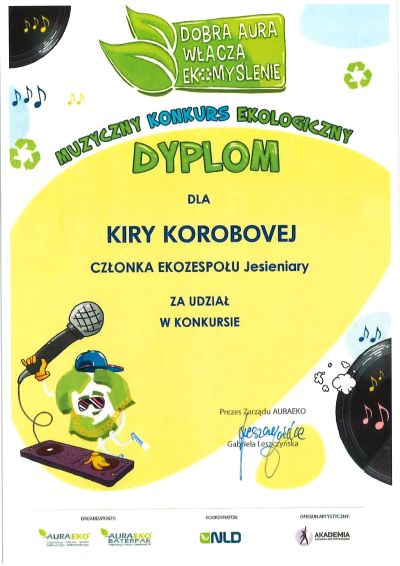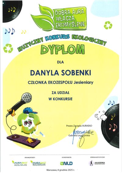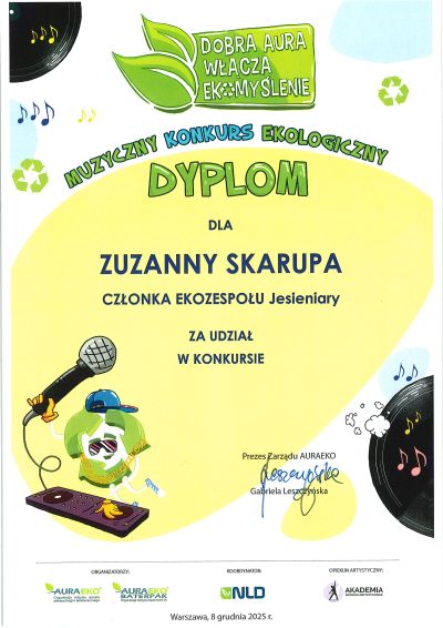 Uczniowie naszej szkoły: Zuzanna Skarupa, Kira Korobova, Danylo Sobenko i Filip Szulc pod opieką nauczyciela Macieja Hoffmanna zostali nagrodzeni za udział w ogólnopolskim konkursie muzycznym „Dobra AURA włącza EKOmyślenie 2025” 🌱 🎶🌿. Konkurs był inspirującym przykładem połączenia muzyki z edukacją ekologiczną. Gratulujemy wszystkim uczestnikom i dziękujemy za wspólne budowanie dobrej aury dla naszej planety 👏😊.