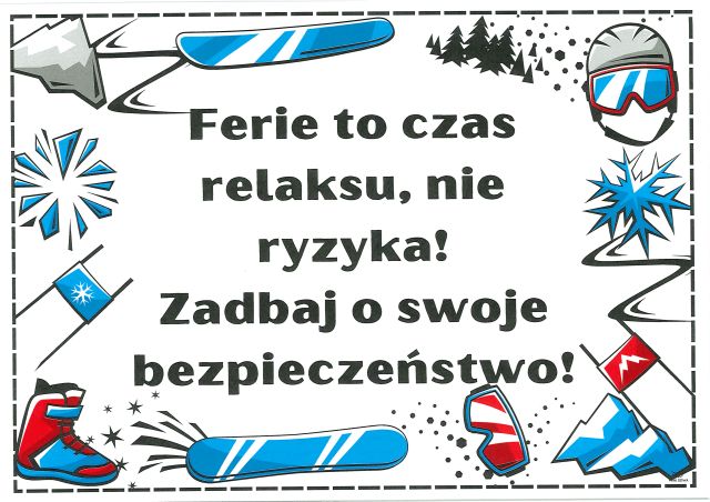 12 lutego 2026 Bezpieczne ferie zimowe Ferie zimowe to czas odpoczynku, zabawy i spotkań z przyjaciółmi. Aby były naprawdę udane, warto pamiętać o zasadach bezpieczeństwa. Bezpieczeństwo to podstawa – dzięki temu ferie będą radosne i pełne miłych wspomnień. ❄️