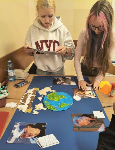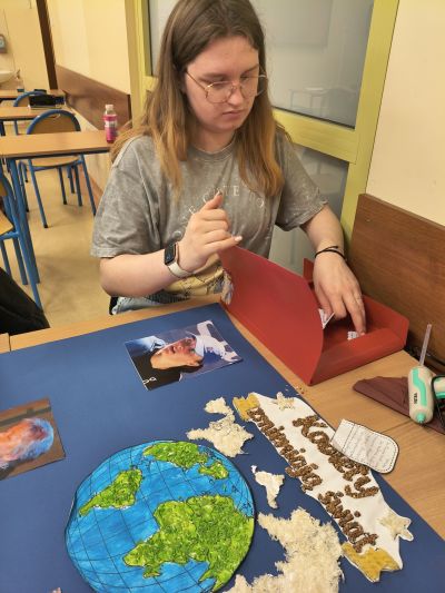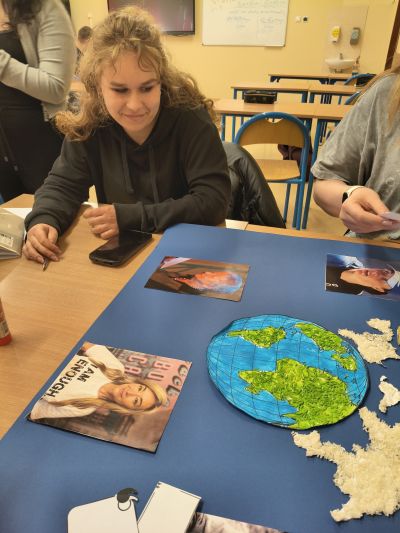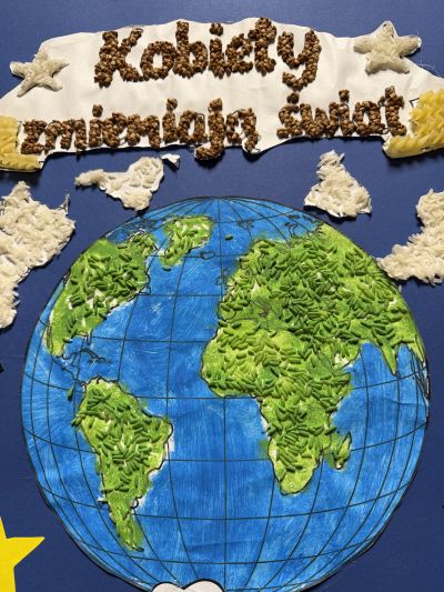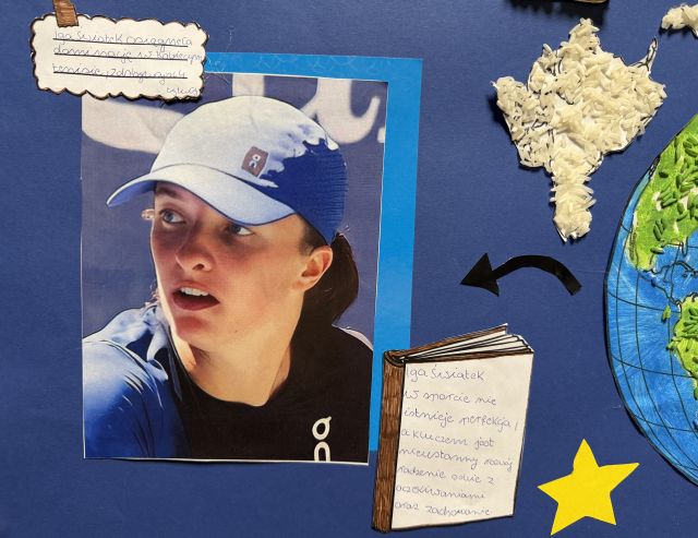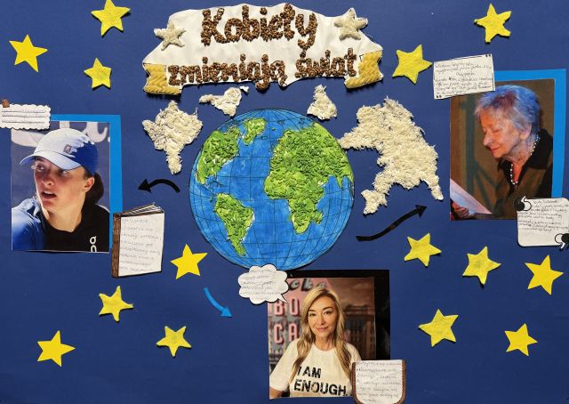 Uczennice klasy 3d przygotowały inspirującą gazetkę w ramach konkursu „Kobiety Bohaterki. Zainspiruj się”. Na plakacie pojawiły się trzy niezwykłe Polki: Iga Świątek, Wisława Szymborska oraz Martyna Wojciechowska, które swoją pasją, determinacją i pracą inspirują kolejne pokolenia. Centralnym elementem pracy jest symboliczna mapa świata, ukazująca, że wpływ kobiet wykracza daleko poza granice jednego miejsca. Gazetka pokazuje różnorodne drogi do sukcesu oraz siłę, talent i wytrwałość kobiet, które swoimi działaniami wpływają na innych i zmieniają rzeczywistość.