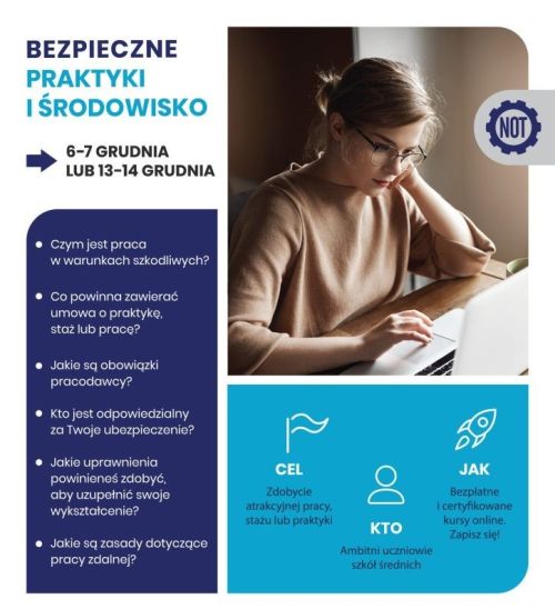 W dniach 13-14 grudnia 2023 r. uczniowie klasy 3a uczestniczyli w kursie online „Bezpieczne Praktyki i Środowisko”. Podczas poszczególnych bloków tematycznych specjaliści z Państwowej Inspekcji Pracy, Państwowej Straży Pożarnej, Zakładu Ubezpieczeń Społecznych, Urzędu Dozoru Technicznego, Wyższego Urzędu Górniczego i Generalnej Dyrekcji Ochrony Środowiska zapoznawali młodzież z podstawowymi zagadnieniami dotyczącymi podjęcia zatrudnienia i funkcjonowania na rynku i w miejscu pracy.