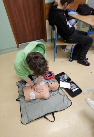 Uczniowie naszej szkoły wzbogacają wiedzę i kształcą praktyczne umiejętności z zakresu udzielania pierwszej pomocy. Podczas zajęć młodzież wykorzystuje treningowy defibrylator AED, który informuje o poszczególnych etapach resuscytacji i defibrylacji za pomocą dźwięków, głosu i instrukcji obrazkowych. Uczniowie uczą się podstawowych technik ratunkowych oraz odpowiedniego reagowania w sytuacjach nagłych, w tym poprawnego wzywania pomocy oraz układania poszkodowanego w pozycji bezpiecznej. Kluczem do skutecznego ratowania życia jest z pewnością edukacja i trening.