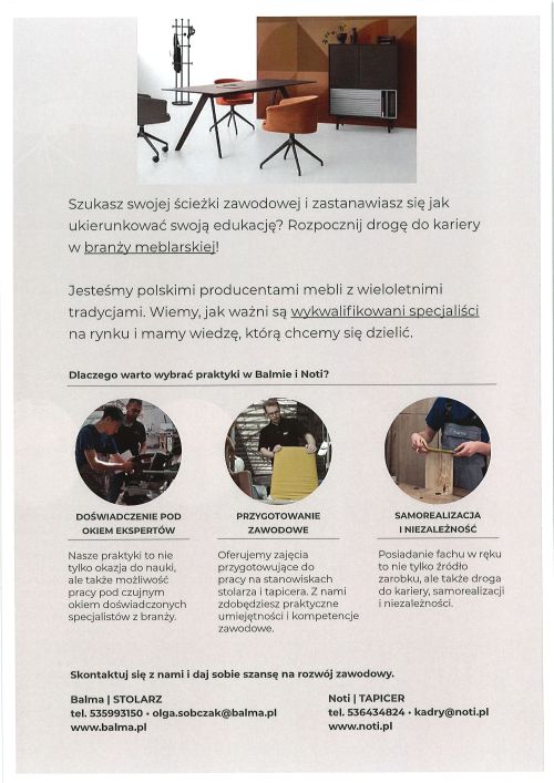 Firmy BALMA i NOTI w Tarnowie Podgórnym przyjmą uczniów na praktyki w zawodzie stolarz i tapicer.