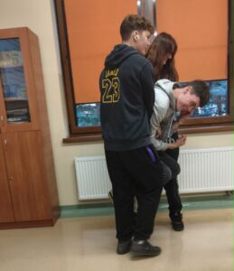 Dokuczanie, wyśmiewanie, izolowanie to sytuacje, które mogą psuć wzajemne relacje w klasie. Uczniowie klasy 3d w ramach zajęć pomocy psychologiczno-pedagogicznej uczestniczyli w warsztatach integrujących grupę, wykonując zadania w losowo dobranych zespołach. Pierwsze – pt. „Kocyk” – polegało na tym, że cała grupa staje na kocu i stojąc na nim, próbuje odwrócić go na drugą stronę. Kolejnym zadaniem było „Krzesło” – gdzie w trójkach należało zrobić ze swoich rąk krzesło i przenieść kolegę/koleżankę z klasy na drugi koniec sali. Celem zajęć było stworzenie silnie współpracującej klasy, gdzie na dokuczanie czy wyśmiewanie nie ma miejsca.