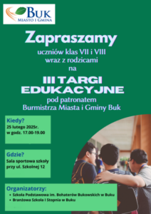 Zapraszamy do wspólnego zaprezentowania się na Targach Edukacyjnych, które odbędą się 25 lutego 2025 roku w godz. 17:00-19:00 w sali sportowej Szkoły Podstawowej w Buku przy ulicy Szkolnej 12. Będzie to niepowtarzalna okazja do przedstawienia oferty praktycznej nauki zawodu w Państwa zakładach pracy.